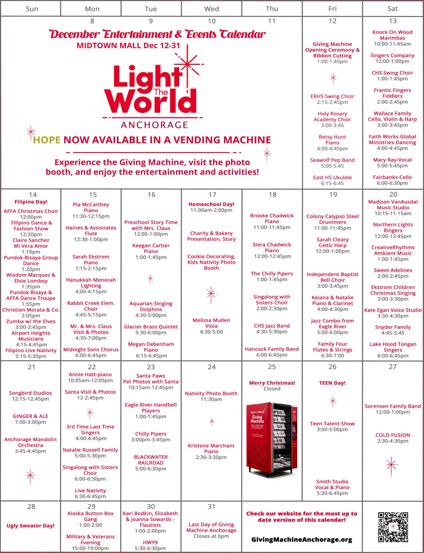 Rather than getting a candy bar at a vending machine, buy food, clothing, and other needed supplies for those in need around the world. Visit the #LightTheWorld Anchorage, Alaska Giving Machine on December 12th – 31st!